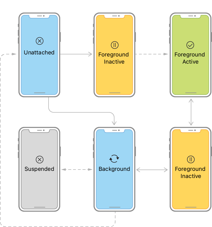 다음 그림은 AppDelegate와 관련된 상태 전환을 보여줌. 앱 실행 후, 시스템은 UI가 화면에 나타날지 여부에 따라 앱을 inActive 또는 Background 상태로 놓음. Foreground로 시작할 때, 시스템은 앱을 자동으로 active 상태로 전환함. 그 후, 상태는 앱이 종료될 때까지 active와 Background 사이에서 변동함
