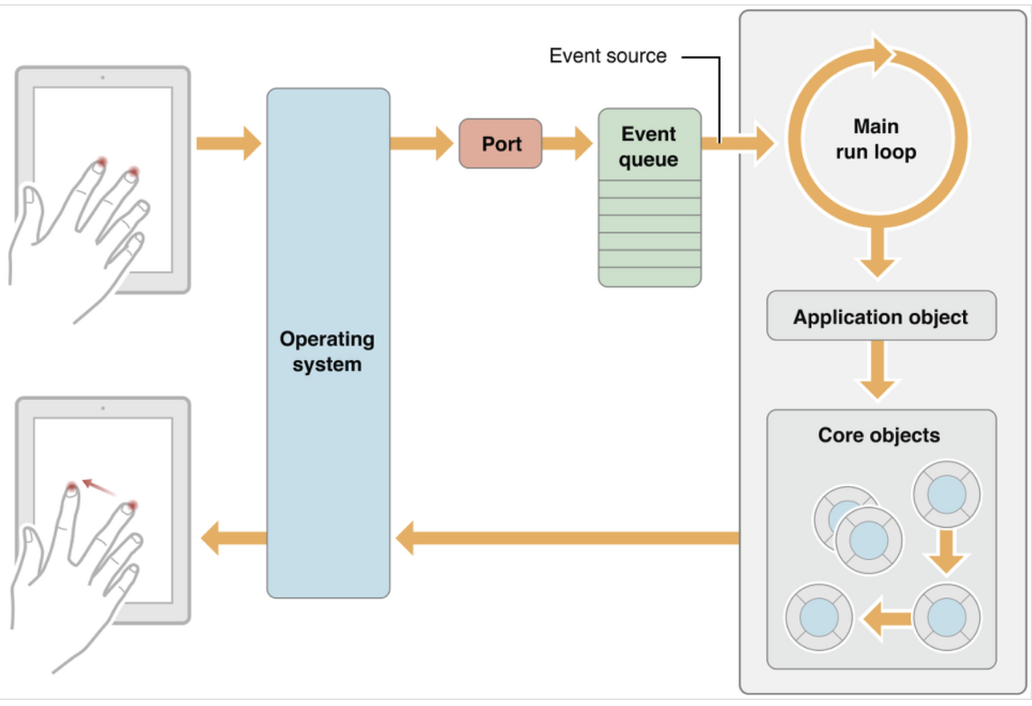 - 사용자가 디바이스에서 특정 액션을 취하면, 그 액션에 해당하는 이벤트가 시스템에 의해 생성되어 UIKit에서 생성한 port를 통해 앱에 전달됨
